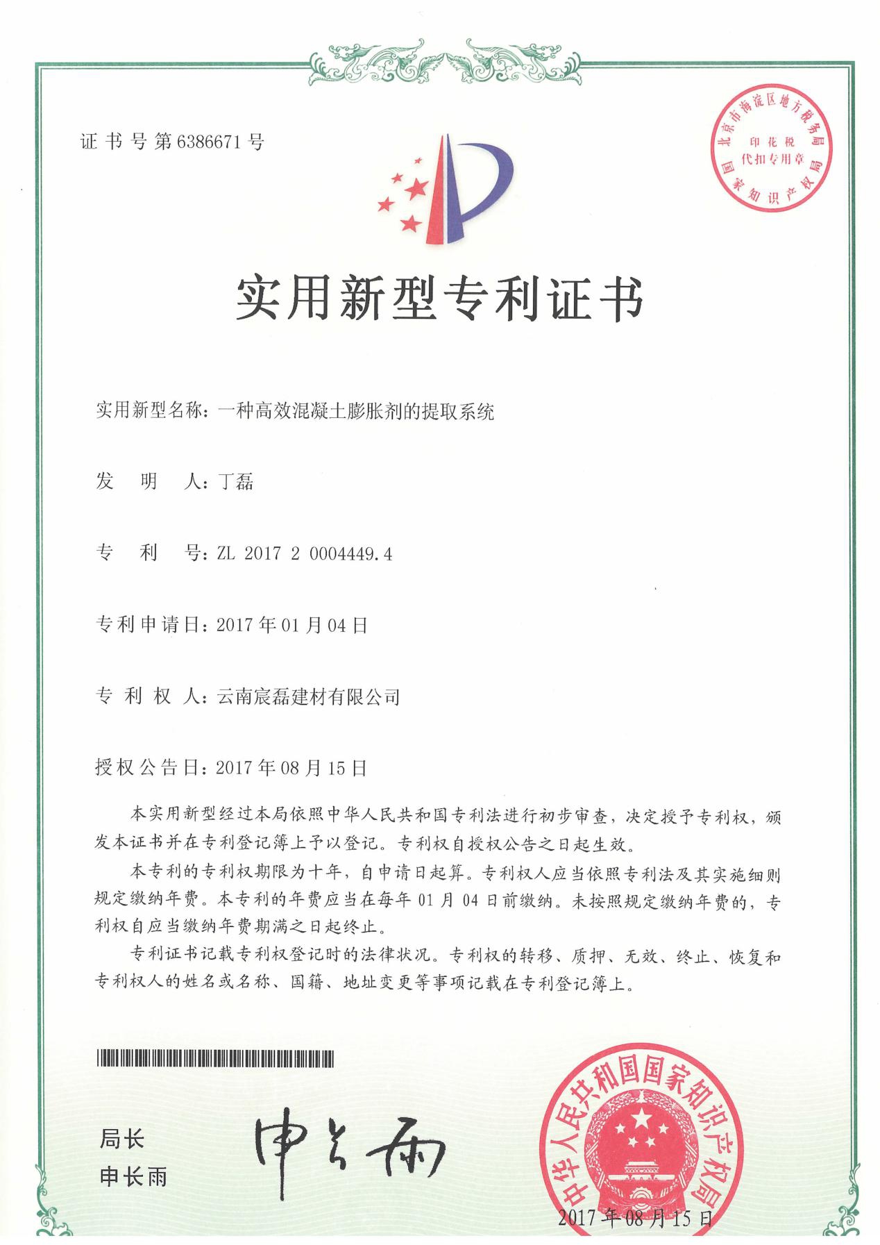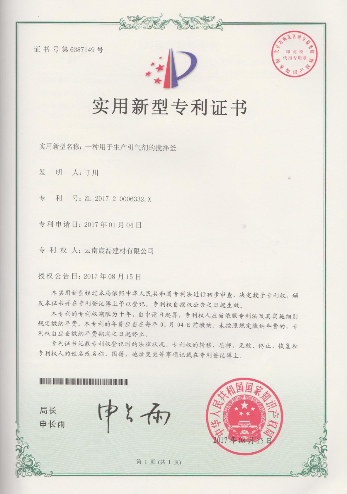">2015年成立技術(shù)研發(fā)中心,2017年成功申報(bào)10余項(xiàng)實(shí)用型專利證書。分別是一種搖動(dòng)減水劑、一種用于生產(chǎn)引氣劑的攪拌釜、一種散裝混凝土膨脹劑下料收塵裝置、一種綜合型聚羧酸減水劑及其制備方法、一種液態(tài)速凝劑添加裝置、一種減水劑生產(chǎn)線廢氣處理設(shè)備、一種減水劑存儲(chǔ)罐、一種混凝土多功能防腐劑生產(chǎn)系統(tǒng)、一種高效混凝土膨脹劑的提取系統(tǒng)、一種早強(qiáng)型聚羧酸減水劑及其制備方法、一種減水劑反應(yīng)釜、一種新型的速凝劑輸送系統(tǒng)。